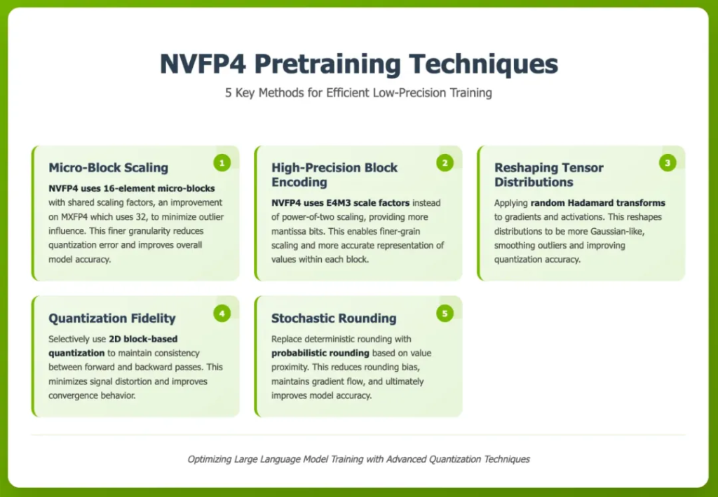 为了实现 4 位精度的预训练,英伟达开发了一套专门的 NVFP4 预训练方案,解决了大规模训练中动态范围、梯度波动以及数值稳定性的核心挑战。