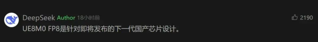 前些天,DeepSeek 在发布DeepSeek V3.1的文章评论区中,提及了UE8M0 FP8的量化设计,声称是针对即将发布的下一代国产芯片设计。